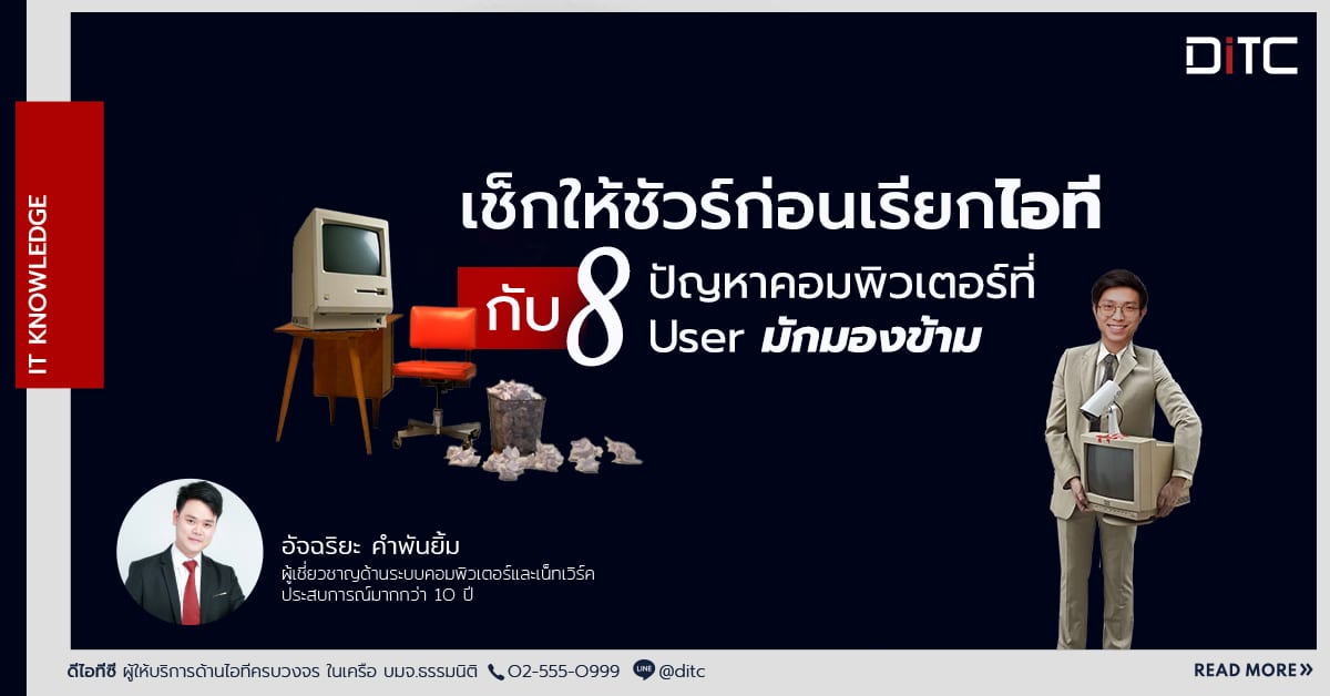 รู้หรือไม่? ปัญหาคอมพิวเตอร์ดัง เครื่องค้าง จอสั่น ปรินต์ไม่ออก เข้าระบบไม่ได้ หาไฟล์ไม่เจอ และอีกนานาปัญหาไอที มีวิธีแก้ไขง่ายๆ ที่ User อย่างเราๆ ทำได้นอกจากการกด Restart เพราะเชื่อว่าจะจบได้ทุกปัญหาเสมือนเป็นยาครอบจักรวาล หรือเรียกหาไอทีทันทีทั้งที่บางทีปัญหาเหล่านั้นไม่ได้เกิดจากอุปกรณ์หรือระบบ แต่เป็น User เองที่ Error หากเพียงสังเกตสักนิดคุณอาจพบว่าคอมฯ ไม่ได้เสียบปลั๊กอยู่ก็เป็นได้…วันนี้ ดีไอทีซี จึงนำ 8 ปัญหาคอมพิวเตอร์ที่ User มักมองข้าม มาแนะนำกัน เผื่อไว้เตือนให้คิดและตั้งสติสักนิดก่อนเรียกไอที