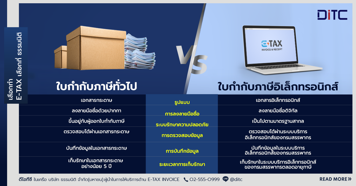 ใบกำกับภาษีอิเล็กทรอนิกส์ (e-Tax Invoice) และใบกำกับภาษีทั่วไป (ใบกำกับภาษีแบบกระดาษ) คือเอกสารทางการเงินสำคัญที่จำเป็นสำหรับธุรกิจและกิจกรรมการเงิน แต่ทั้ง 2 แบบนี้มีความแตกต่างกันอย่างไร และจะเลือกใช้แบบไหนที่ทำให้ชีวิตคุณง่ายและสะดวกมากขึ้น? DiTC ผู้ให้บริการด้านระบบ e-Tax Invoice & e-Receipt อย่างครบวงจร มีคำตอบมาฝากค่ะ