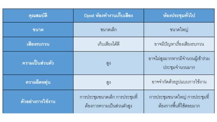 ตารางเปรียบเทียบคุณสมบัติของ Dpod ห้องทำงานเก็บเสียง และห้องประชุมทั่วไป